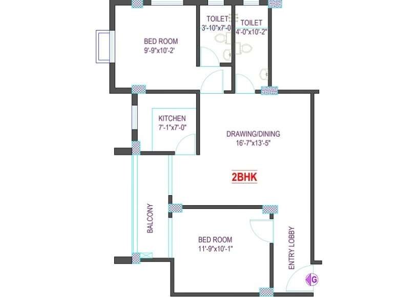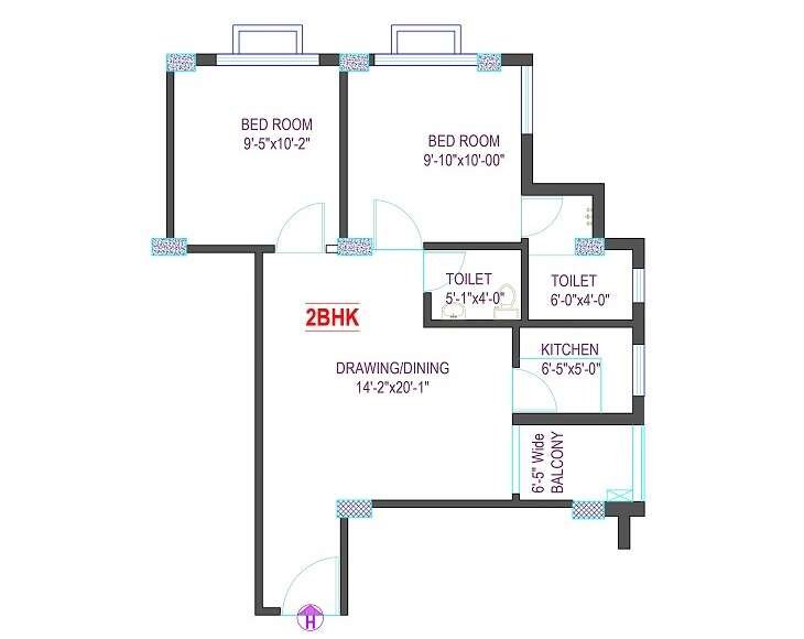 This 2BHK apartment, covering approximately 680 sq.ft., offers an efficient and comfortable layout suitable for small families. It features two well-proportioned bedrooms—one sized 9′-5″ × 10′-2″ and the other 9′-10″ × 10′-0″—providing enough space for essential furnishings and personal comfort. The central drawing/dining hall (14′-2″ × 20′-1″) acts as the heart of the home, offering a generous area for family gatherings, entertainment, and daily activities.