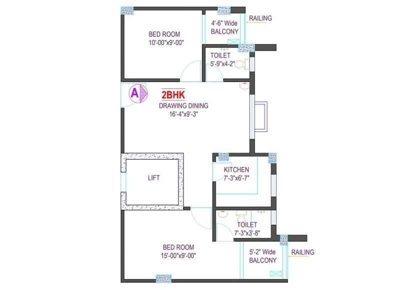This 2BHK apartment layout offers a well-designed living space ideal for small families. It includes two bedrooms, one measuring 9′-5″ × 10′-2″ and the other 9′-10″ × 10′-0″, both suitable for essential furniture arrangements. The spacious drawing/dining hall (14′-2″ × 20′-1″) serves as the central gathering area, providing ample room for family activities and entertainment.