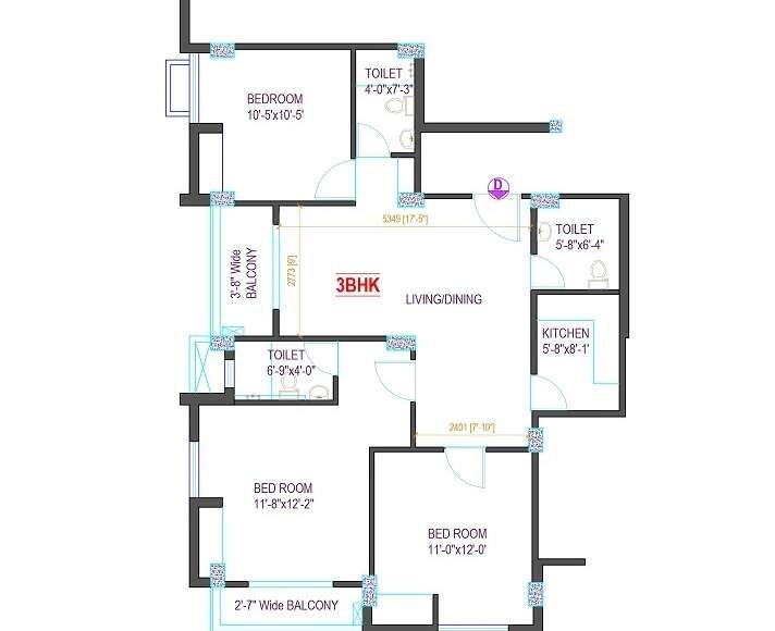 The plan features two separate toilets, enhancing convenience and privacy for residents. A compact and efficient kitchen (6′-5″ × 5′-0″) connects directly to a 6′-5″ wide balcony, offering ventilation and a useful outdoor space for daily chores. The layout ensures smooth movement between rooms and makes excellent use of available square footage.