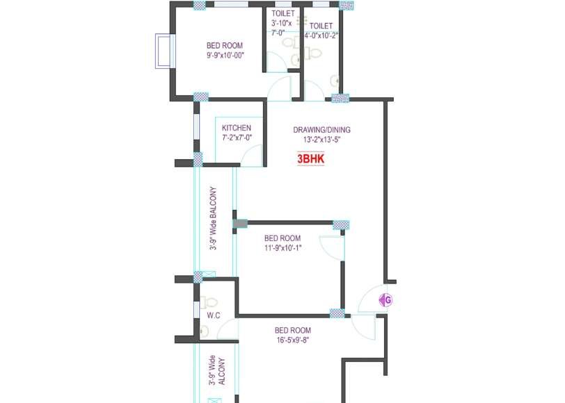 This 3BHK layout with an 803 sq.ft. carpet area offers a well-organized and efficient arrangement, centered around a spacious drawing/dining area measuring 13′-2″ × 13′-5″. The kitchen (7′-2″ × 7′-0″) is positioned conveniently beside the living space and opens toward a 3′-9″ wide balcony, enhancing ventilation and natural light. One bedroom (9′-9″ × 10′-0″) lies near the kitchen and is supported by two adjacent toilets (3′-10″ × 7′-0″ and 4′-0″ × 10′-2″), making this section ideal for practical daily use.