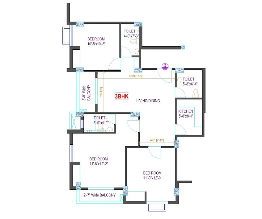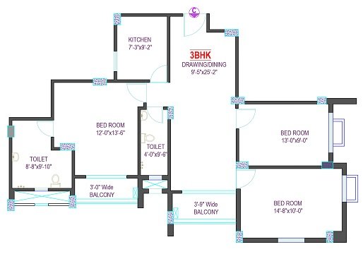 This 3BHK apartment, with a carpet area of 833 sq.ft., is thoughtfully designed around a central living/dining space that ensures smooth movement to every part of the home.